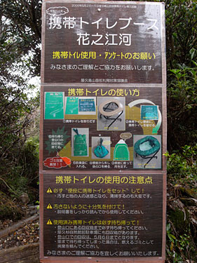 一日の調査を終え、色々と考えました。携帯トイレ、決して完璧とは言い難いものであるのは間違い無いと思います。でも、屋久島の現状を考えると、今は携帯トイレで繋いでいく必要があると思います。荒川登山口のトイレが改修される事が決まり、新高塚小屋もバイオトイレになることがほぼ決まっています。今あるトイレを新たな物にしながらも、新設出来ない場所(地理的・財政的に)は当面携帯トイレでやっていった方が良いと思います。現に、GW中の花之江河と言ったらティッシュの花盛りなのに、今年は皆無!これだけでも山の実質的・視覚的な美しさは格段に違います。携帯トイレ自体がゴミを増やすことになるので、100%のものではないでしょうが、携帯トイレそのものをもっともっと新たな発想で創っていっても良いのではとも思いました。極端な話、男の人なんてペットボトルを改良したものに尿を入れて、里で普通にトイレに流せば軽いし(笑)かさばらないし、漏れないし!ボトルは洗ってまた使えば良いと思う。ゴミは出ないし、山からの屎尿搬出量は減るし、良いと思うけどなぁ!誰か、女性版を考えてください(笑)大きい方は、土で分解するタイプとかもあるけど、もっともっとゴミが出ない方法は無いかなぁ。極論、人がたくさん居なければ自然が分解してくれます。でも、人が集中する登山道は、特に高所では分解速度も遅いし、キャパが少ないです。みんながみんな、野外トイレのきちんとした方法を知っている訳でもないしね。というか、知らない人の方が多いだろうなぁ。それに、そこに住んでいない限りその場所のさじ加減を判断するのは難しいかもね。これを機に、もっともっと深く考えていきたいです。