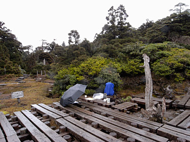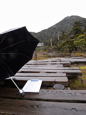 さて、朝5:30に淀川登山口を出て、7:00花之江河到着。ここで、トイレブースのチェックをしたりして、記入すべき用紙を準備。6:30から雨が降り出し、傘をさしての調査開始となりました。あまりにも寒いので、おもむろにズボンを脱ぎ、パッチ(タイツ)を装着。これで、腰の冷えがとれました。もはや真冬並みの装備(笑)ジッとしているのって、本当にキツイっす。