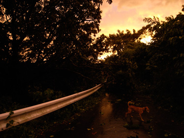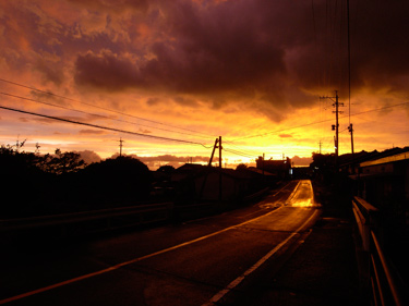 極めつけは集落に通じる道路。濡れた路面に何とも言えない夕焼けが彩りを加えていて・・・。
