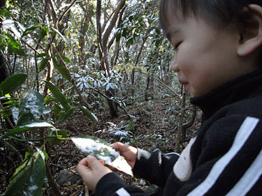 息子は始めて見る雪が面白いらしく、触ったり葉っぱに付いた雪を食べたりしてました。