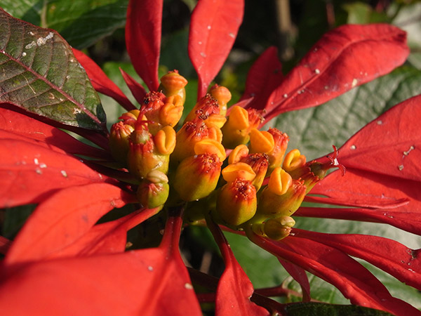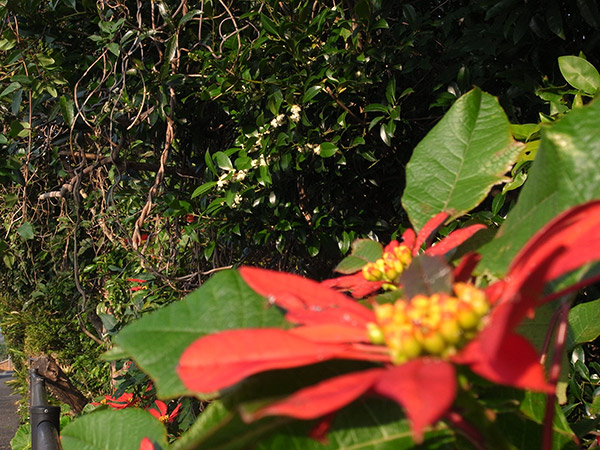 手前には年末から咲いているポインセチアが実になり始めている。