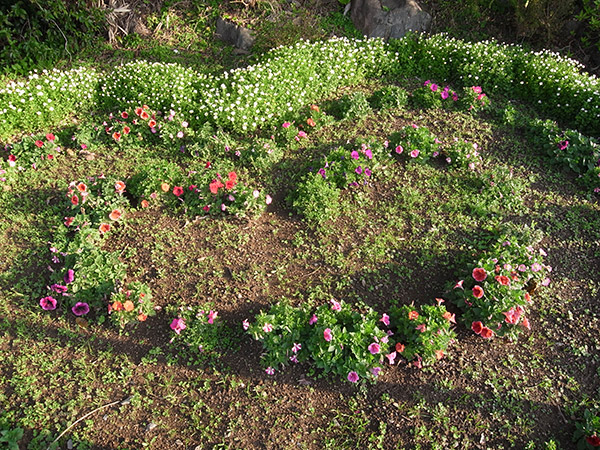 ルンルンで帰っていると、八幡神社横に婦人会の方達が手入れしている花壇がある。