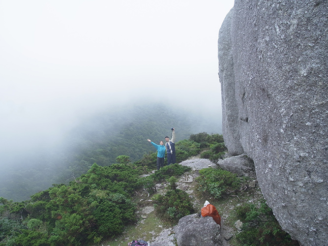 以前、Yさんとこの山を登ったのですが、その時は雪がガッツリと登山道を覆う中、足がズボズボとはまりながらの登山でした。今回は、前線が抜けた直後で、強い風と共に深く濃いガスの中を歩きました。森は本当に幻想的でしたねぇ〜♪