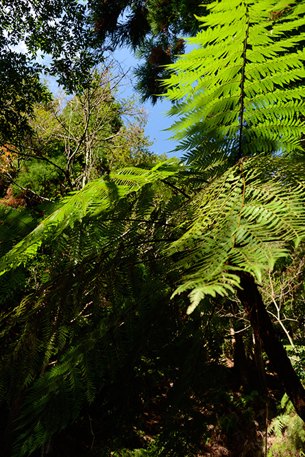 澄み渡る青空を見上げると、ヘゴの緑が鮮やかでした