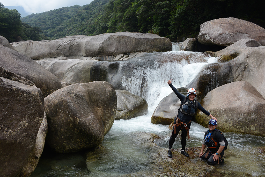 ヤクザルも覗きに来ました(笑)3連ポットホール、左には数十m続く渕、右は楽しい高速ウォータースライダー