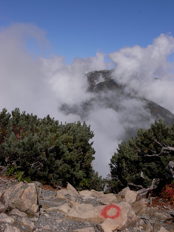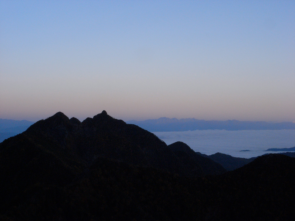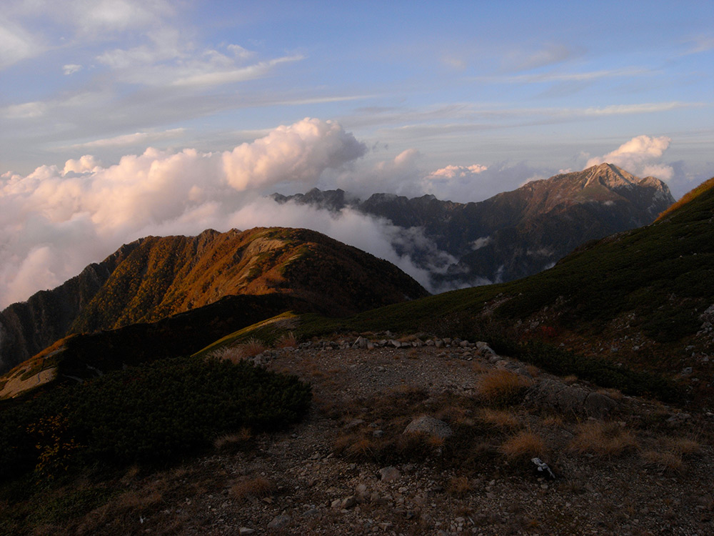 六合石室を出てから一時間ほど登るのだが、眼下には雲海がびっしりと広がっていた。まるで誰かがクリームをぶちまけたようだ!トロリとした雲海の向こうには、去年訪れた北アルプスの山々が遠く彼方までその山脈を連ねている。美しい♪やっと巡り逢えた光景だ・・・。この素晴らしい景色に巡り合わせてもらえた事に感謝するばかりだ。特に雨続きだったので、この感動もひとしおだった。