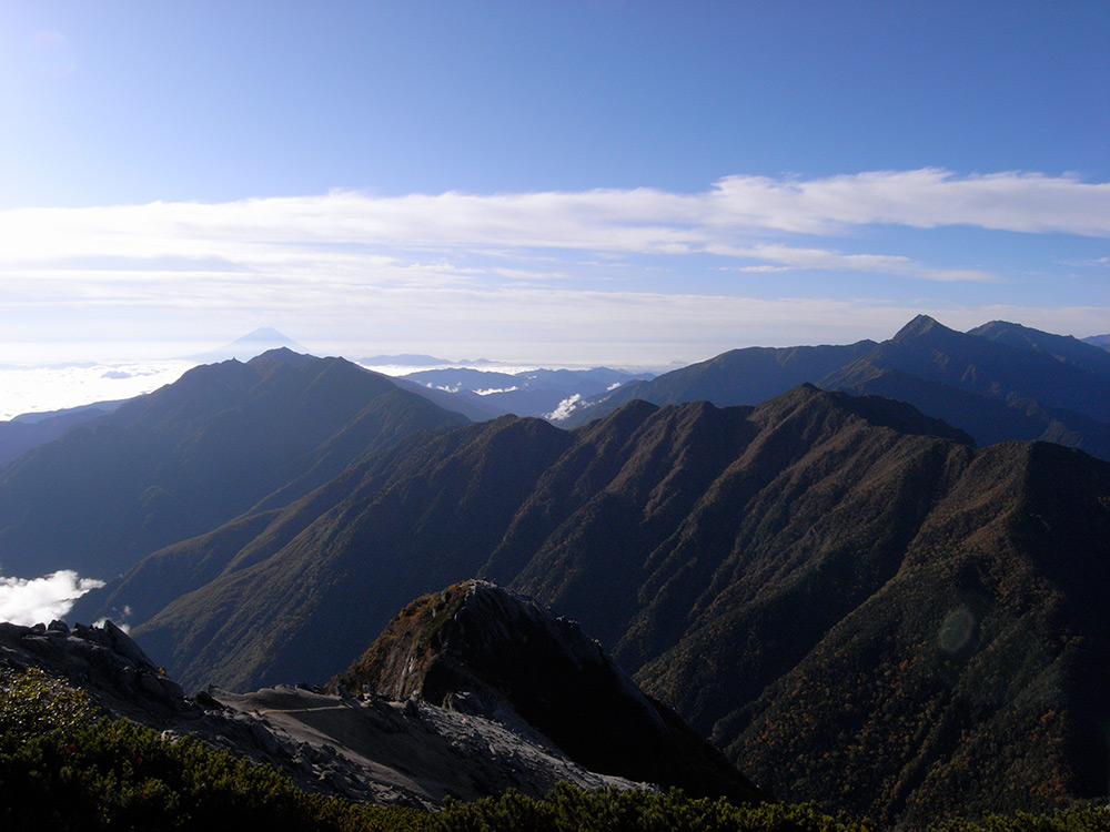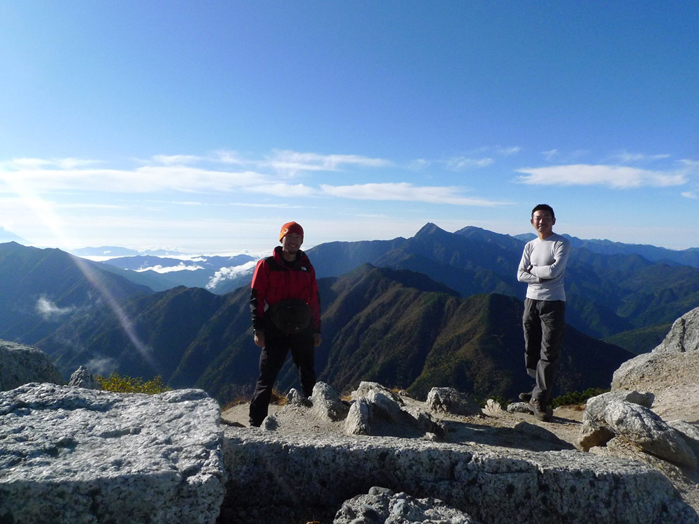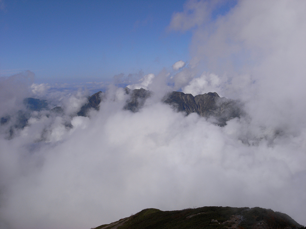 周りを見渡せば雨の中歩き続けた早川尾根が顔を出している。ずっと雨の中見てきた尾根が晴れていると、なんか妙に面白くなってくる(笑)ステキな尾根だったけど、いつかこんな天気でも歩いてみたいナァ。