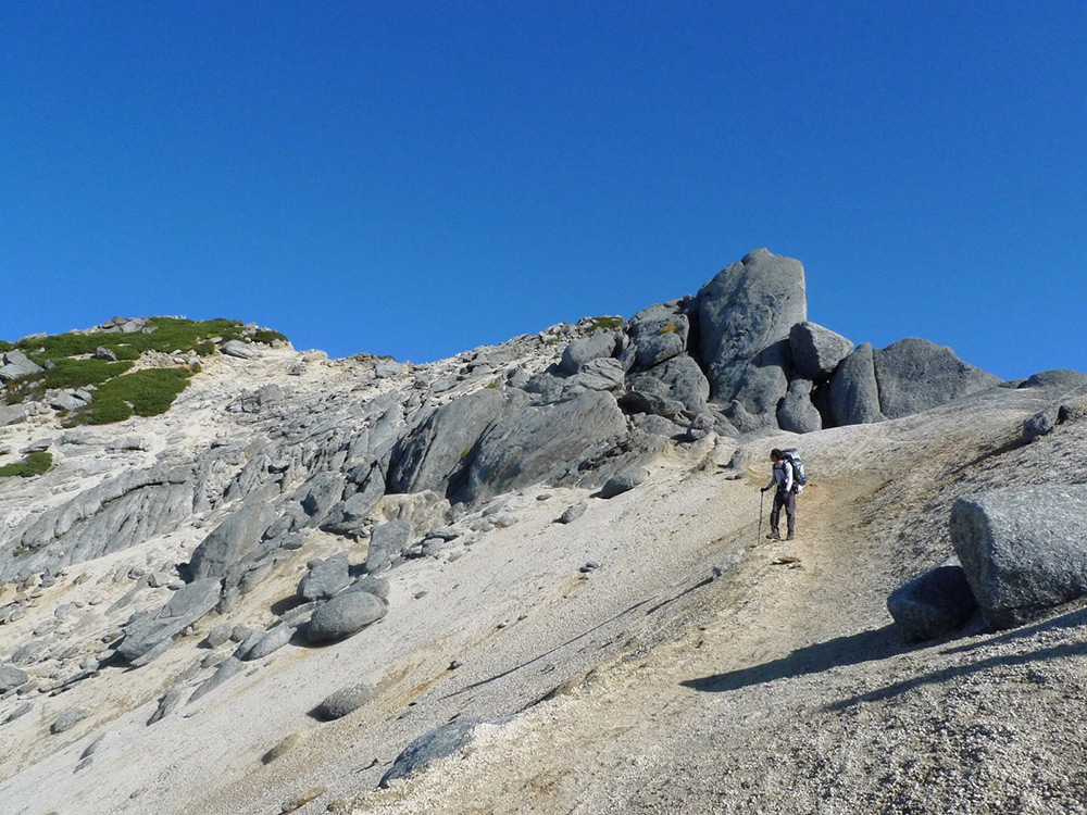 心地よい秋の空の下、優しい太陽の陽を浴びながら甲斐駒ヶ岳を下っていく。下りは、直登ルートでなく、太郎ちゃんが登りに使った迂回ルートだ。風化した花崗岩が砂浜の砂のように足元を覆っている。ゆっくり歩くと大変なので、勢いを逃がしながらグングン下っていく。