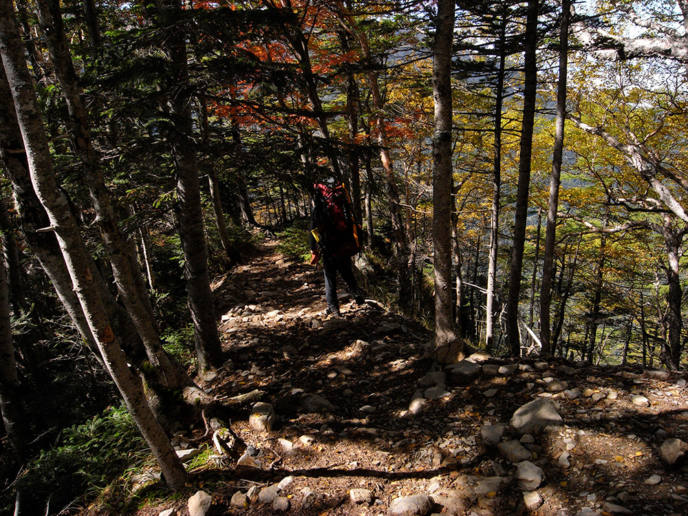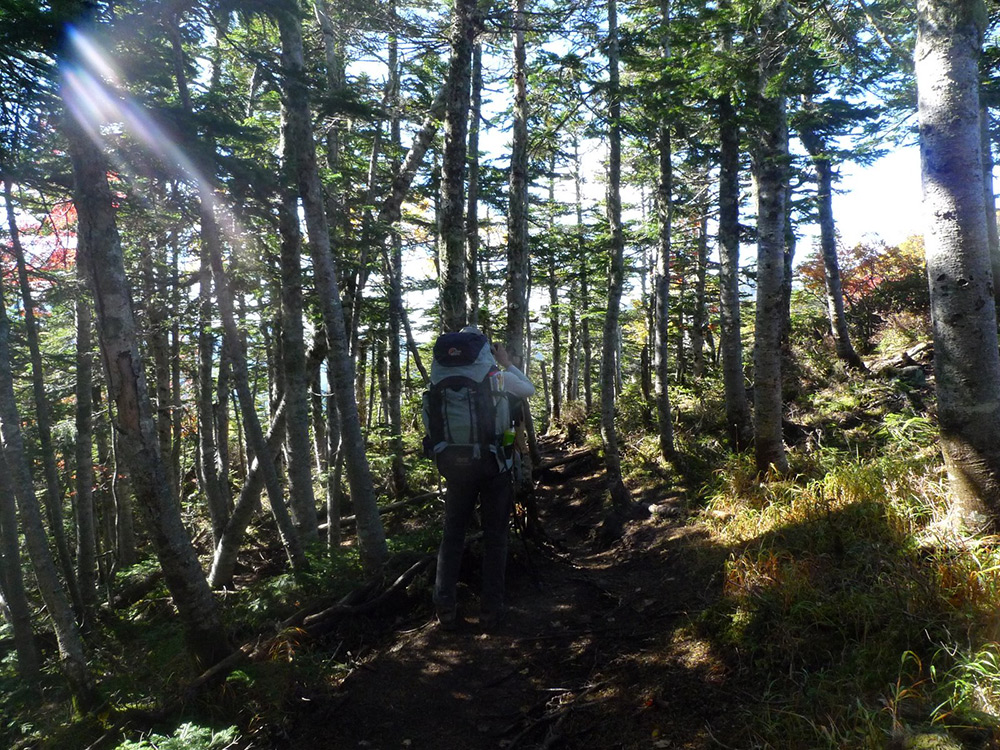 さて、水力発電で動いている綺麗なトイレを借り、エネルギー補給をしたら再出発だ。道は勾配が緩く、しかも良く整備されていて歩きやすい。シラビソが立ち並ぶ森の中をじんわりじんわりと登っていく。なんせ一年ぶりの外の山だから、見る物全てが新鮮♪綺麗な景色に巡り会う度に、「はぁ~♪」とため息付いて眺めては、写真を撮り(笑)後ろ姿から楽しさが伝わってきませんか?(笑)